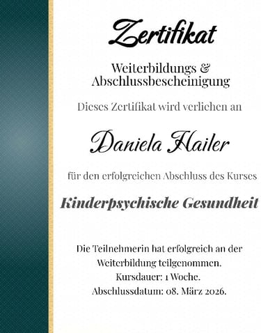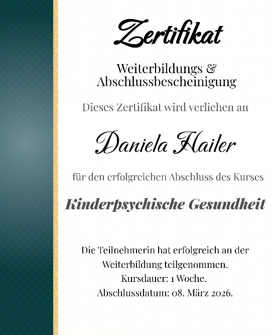 Den Kurs „Kinderpsychische Gesundheit“ habe ich Online erfolgreich abgeschlossen. Der Kurs dauerte etwa eine Woche und vermittelte grundlegende Kenntnisse über