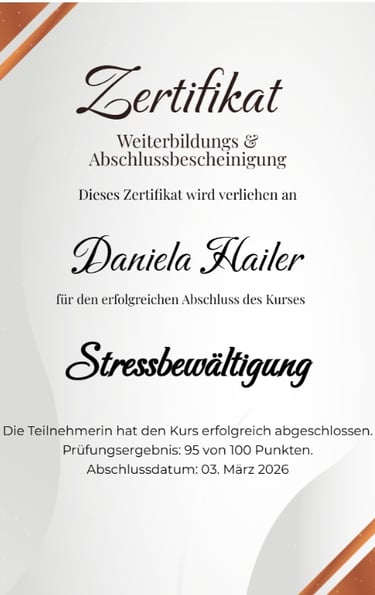 Als professionelle Begleiterin für Stressregulation und mentale Stärke ist es mir wichtig, nicht nur Methoden anzuwenden, sondern diese auch fundiert gelernt und sichtbar zertifiziert zu haben.