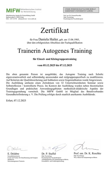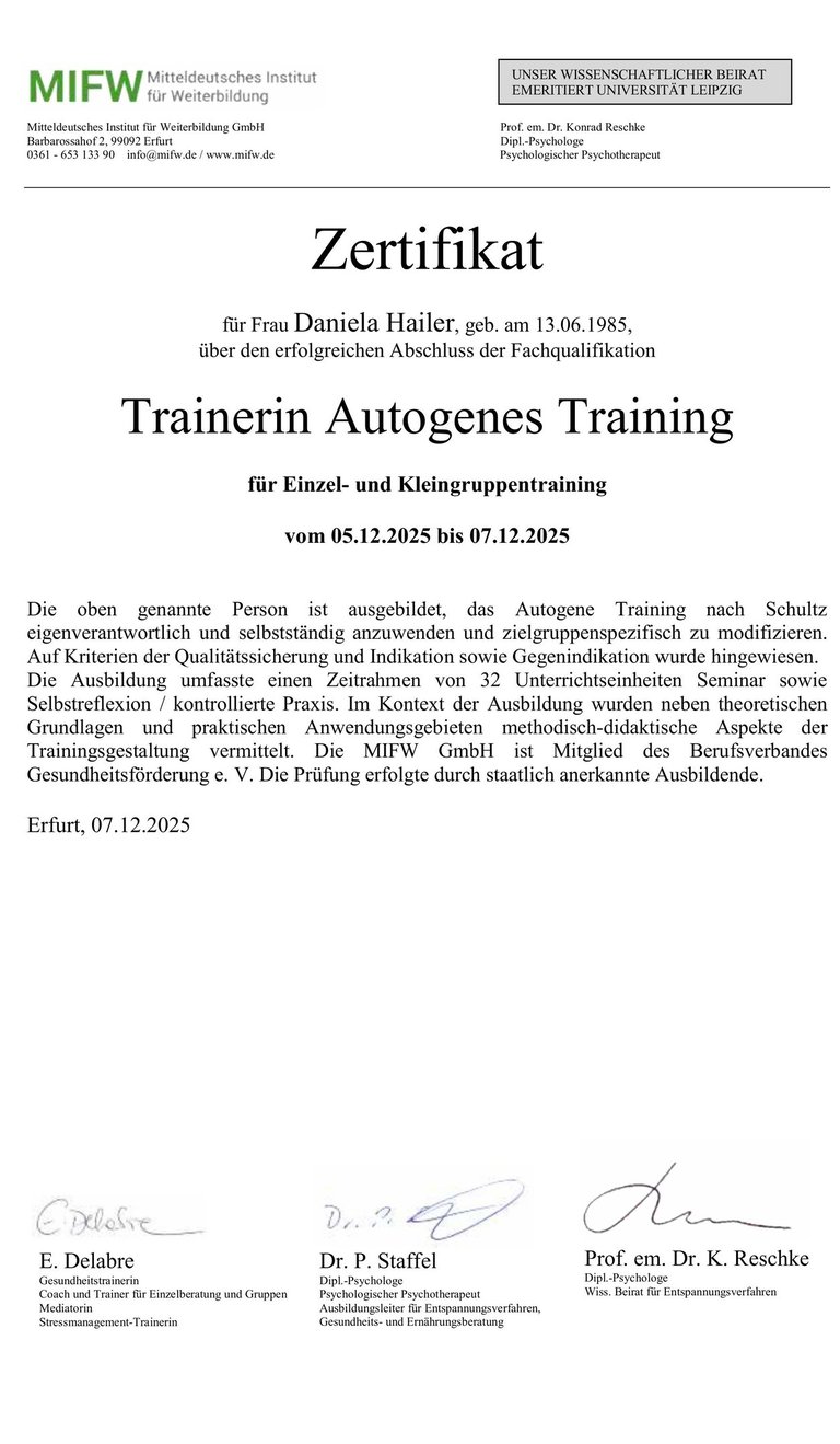 Im Rahmen meiner Ausbildung zum Trainer für Autogenes Training am Mitteldeutschen Institut für Weiterbildung (MIFW) habe ich fundierte theoretische und praktische Kenntnisse in einer der bekanntesten Entspannungsmethoden erworben.