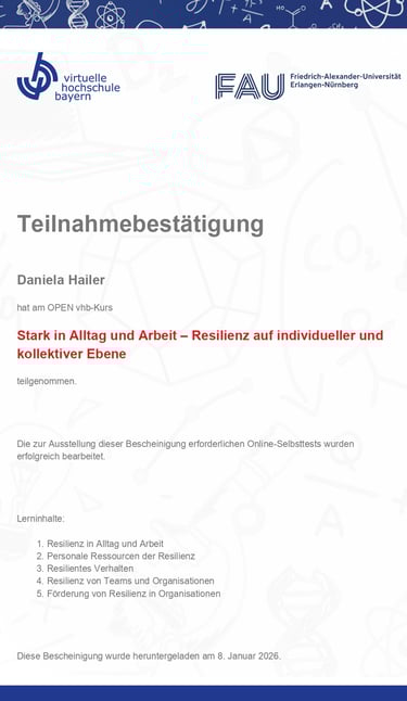 Im Rahmen meiner Weiterbildung an der Virtuelle Hochschule Bayern habe ich den Onlinekurs „Stark in Arbeit und Alltag – Resilienz auf individueller und kollektiver Ebene“ erfolgreich abgeschlossen.