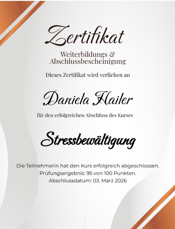 Den Onlinekurs „Stressbewältigung“ habe ich Online absolviert und mit einer Abschlussprüfung von 95 von 100 Punkten erfolgreich bestanden. Der Kurs vermittelte umfassende Grundlagen zum Thema Stress, dessen Entstehung sowie wirksame Strategien zur Stressreduktion im Alltag.