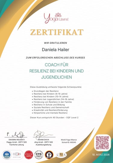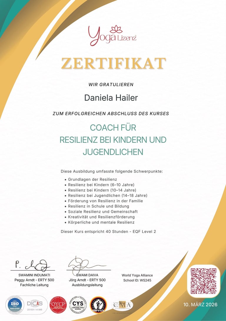 Im Rahmen meiner Weiterbildung zum Coach für Resilienz mit Kindern und Jugendlichen habe ich mich mit der Förderung von emotionaler Stärke, Stressbewältigung und persönlicher Entwicklung bei jungen Menschen beschäftigt.
